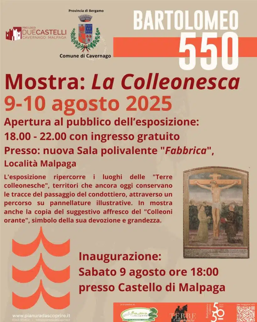Il comune di Cavernago vi invita a โLa Colleonescaโ. In occasione del 550ยฐ anniversario dalla morte del celebre condottiero Bartolomeo Colleoni, la mostra โColleonescaโ celebra la memoria e lโereditร di una delle figure piรน emblematiche del Rinascimento italiano. Allestita nella nuova sala polivalente โFabbricaโ, accanto al Castello di Malpaga, lโesposizione ripercorre i luoghi delle โTerre colleonescheโ, territori che ancora oggi conservano le tracce del passaggio del condottiero, attraverso un percorso su pannellature illustrative.