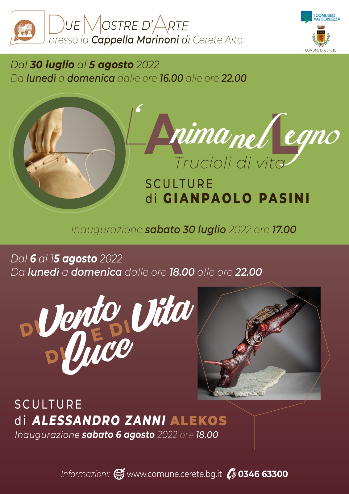 Dal 6 agosto sarà possibile ammirare le opere dello scultore Alessandro Zanni Alekos, presso la Cappella Marinoni di Cerete Alto, all'interno della mostra "Di ventom di luce e di vita".