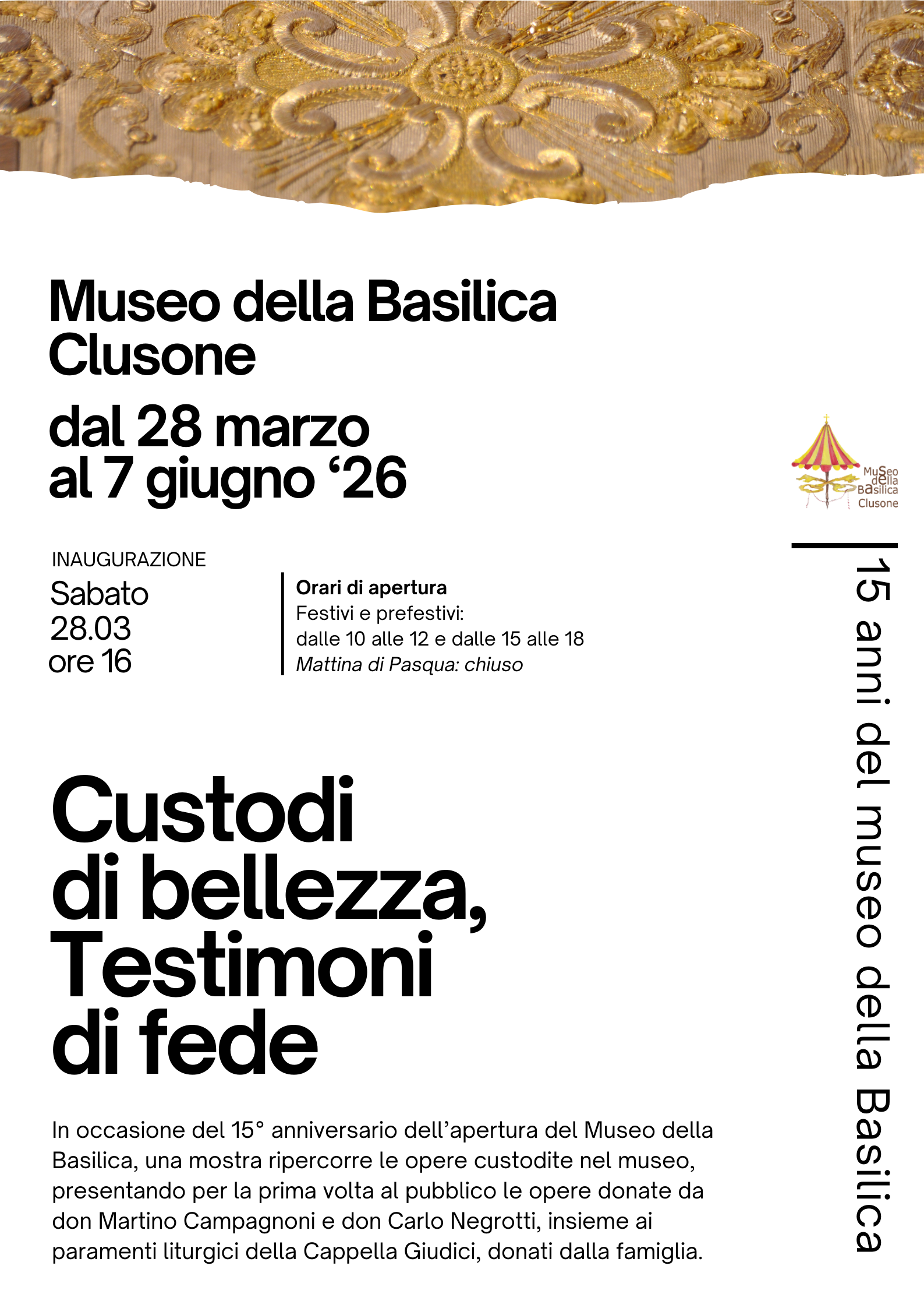 Proseguono le iniziative delle ยซSettimane della Culturaยป con una mostra in occasione del quindicesimo anniversario del Museo della Basilica a cura della Parrocchia S. M. Assunta e S. G. Battista Clusone.