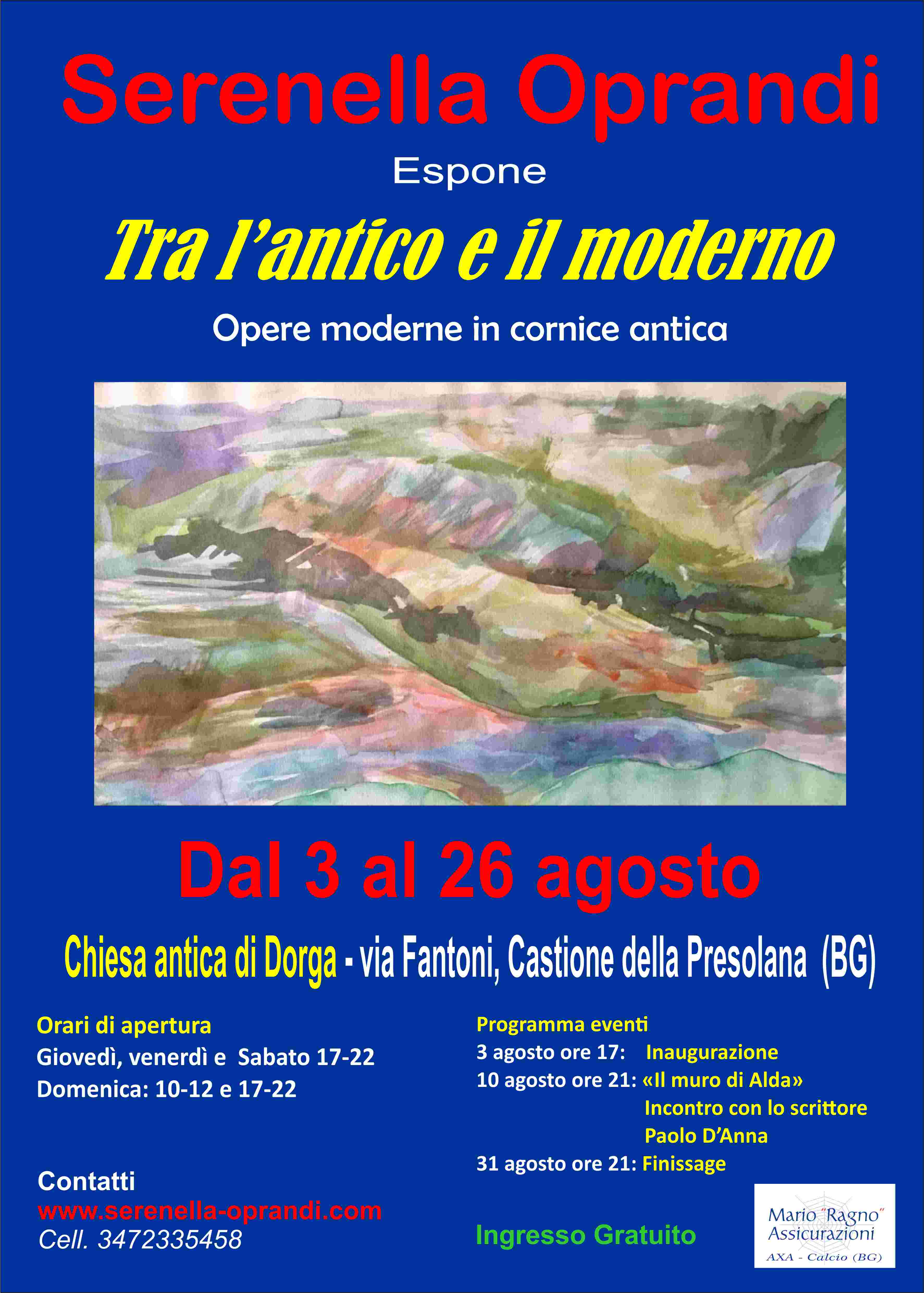 La pittrice Serenella Oprandi espone le sue opere dal 3 al 26 agosto presso la Chiesa antica di Dorga - via Fantoni, Castione della Presolana.