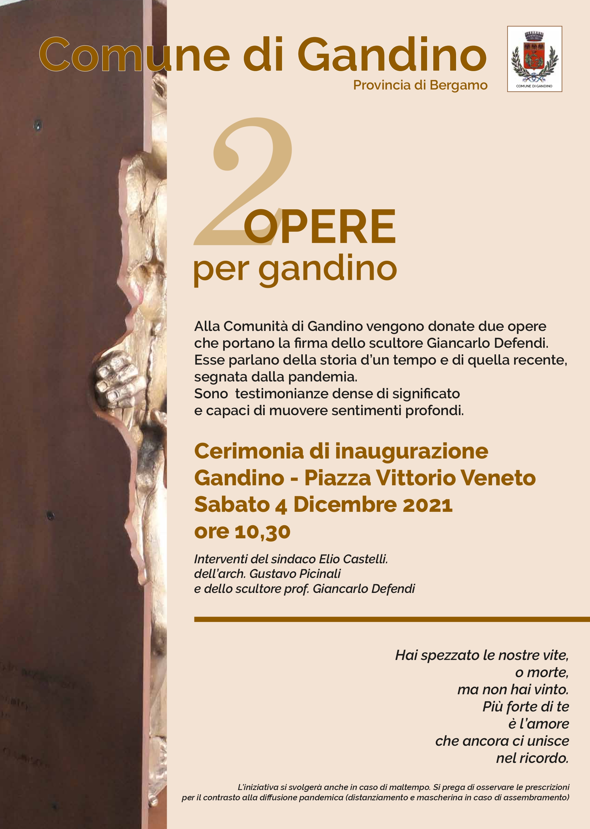 Alla Comunità di Gandino vengono donate due opere che portano la firma dello scultore Giancarlo Defendi. Esse parlano della storia d’un tempo e di quella recente, segnata dalla pandemia. Sono testimonianze dense di significato e capaci di muovere sentimenti profondi.