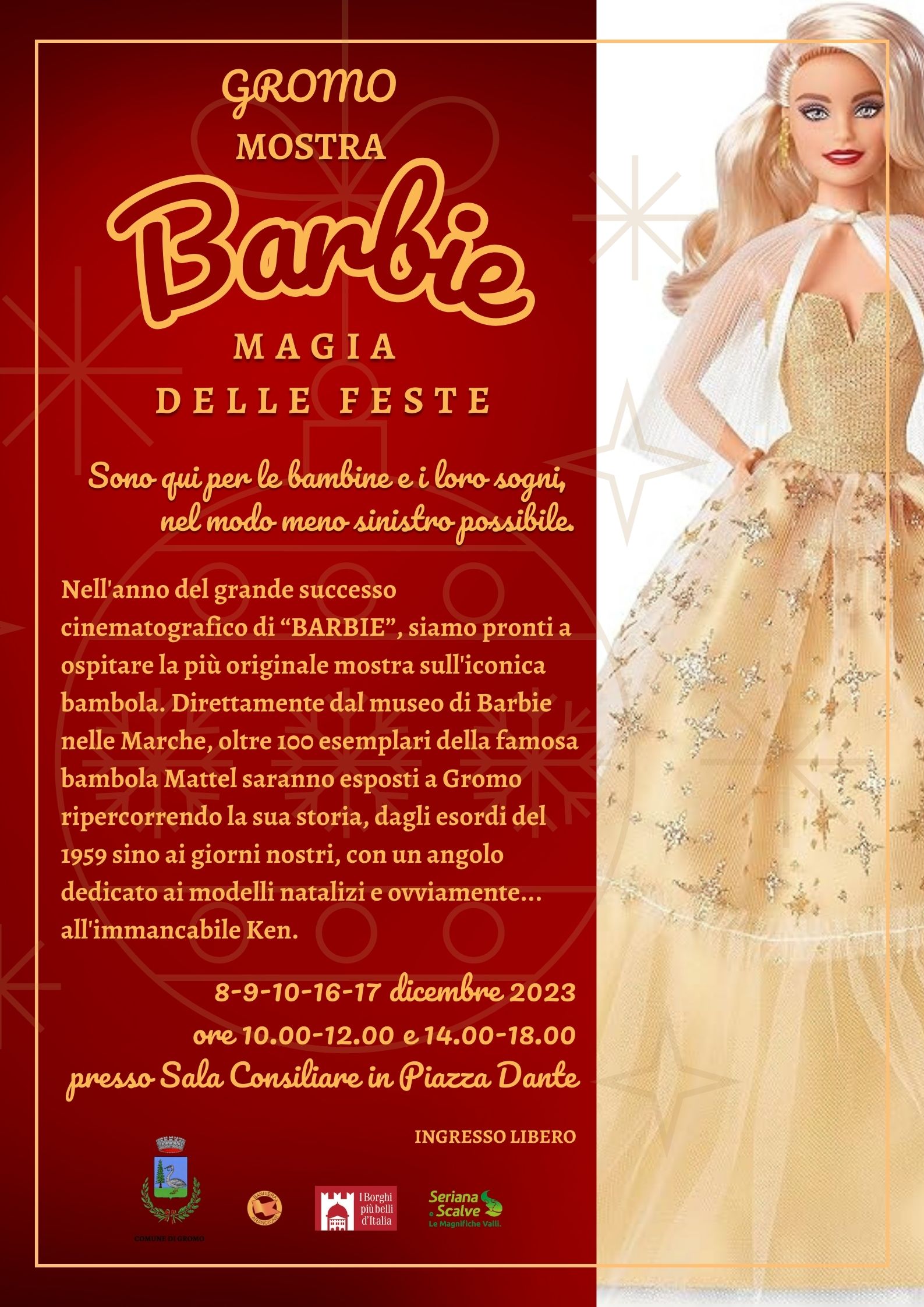 Nell'anno del grande successo cinematografico di "Barbie", siamo pronti a ospitare la più originale mostra sull'iconica bambola. Direttamente dal museo di Barbie nelle Marche, oltre 100 esemplari della famosa bambola Mattel saranno esposti a Gromo ripercorrendo la sua storia, dagli esordi del 1959 sino ai giorni nostri, con un angolo dedicato ai modelli natalizi e all'immancabile Ken.