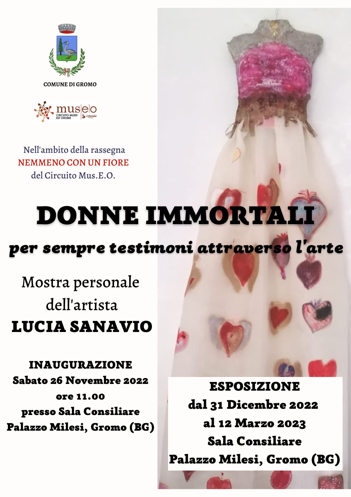Nell’ambito della rassegna "Nemmeno con un fiore" del Circuito Mus.E.O. si terrà la mostra personale dell'artista Lucia Sanavio "Donne immortali: per sempre testimoni attraverso l'arte”.