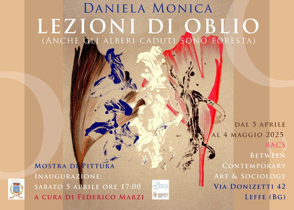 Il BACS – Between Contemporary Art and Sociology ospita Lezioni di Oblio, la mostra personale di Daniela Monica, visitabile dal 5 aprile al 4 maggio 2025. L’inaugurazione è in programma sabato 5 aprile alle 17.