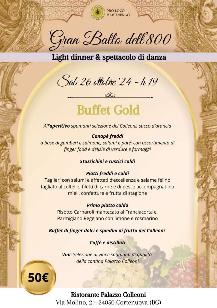 L’evento organizzato dall’associazione Pro Loco Martinengo APS in collaborazione con Palazzo Colleoni e con la Società di Danza Circolo Bergamasco di Stezzano, vedrà una deliziosa cena con intermezzi di danze ottocentesche in abiti d’epoca. Un’immersione a 360° nelle atmosfere dei balli dell’800 per assaporare il fascino e l’eleganza di un ‘epoca ormai lontana.
