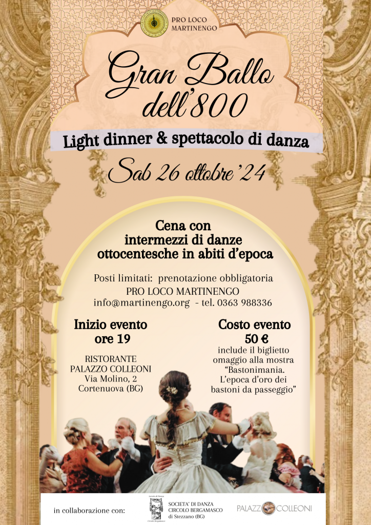 In occasione della mostra Bastonimania, un evento da non perdere, unico nel suo genere: avete mai sognato di indossare costumi d'epoca, danzare sulle note musicali di un'orchestra, passare una serata in un affascinate salone ottocentesco con dipinti, lampadari di cristallo e banchetti, in pieno stile Jane Austen? Questa sera in programma il Gran Ballo Ottocentesco organizzato presso il ristorante Palazzo Colleoni: un’esclusiva light dinner con spettacolo di danza.