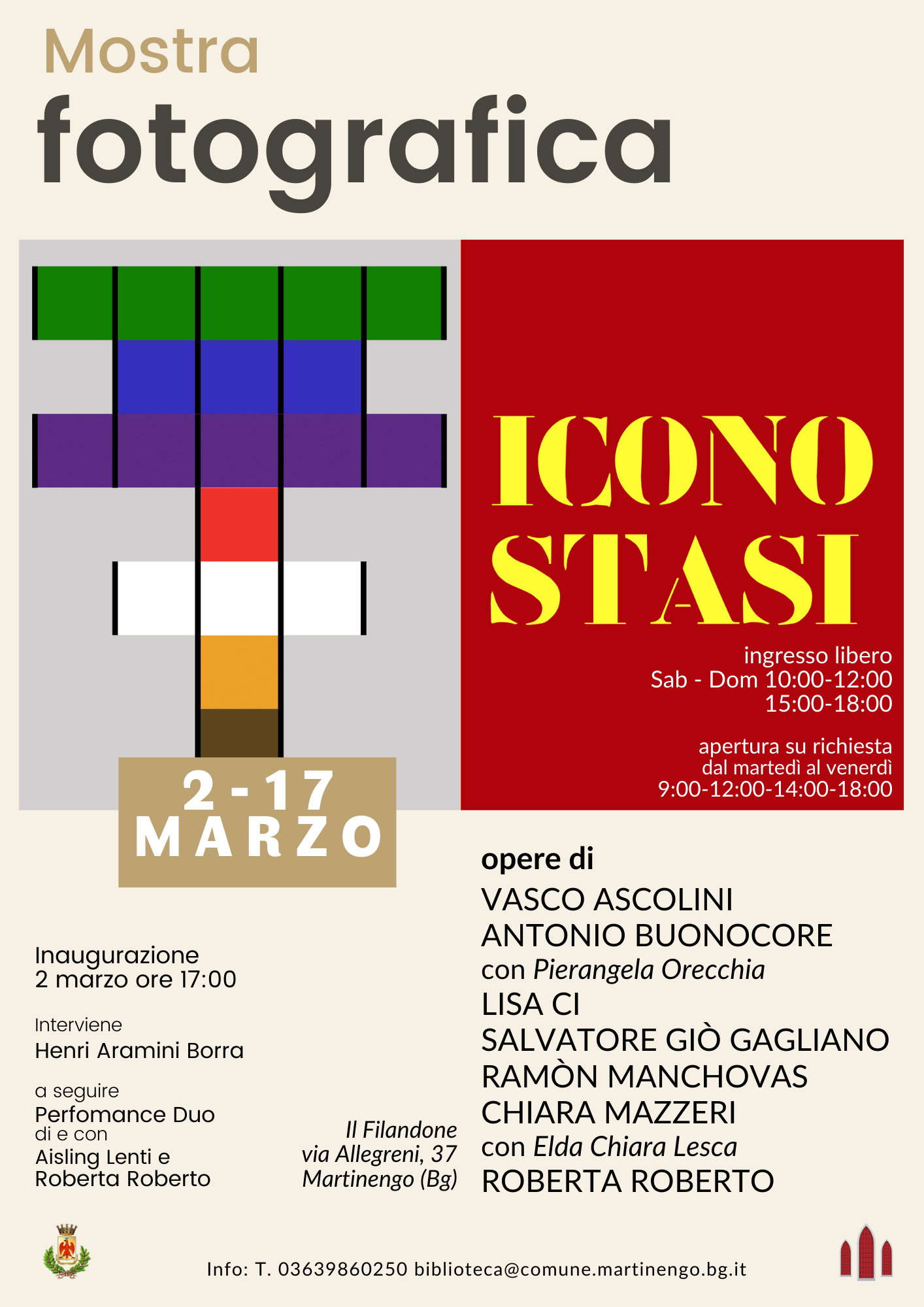 Dal 2 al 17 marzo 2024 il Filandone ospita in sala consiliare la mostra fotografica "Iconostasi". Saranno esposte opere di Vasco Ascolini, Antonio Buonocore con Pierangela Orecchia, Lisa Ci, Salvatore Giò Gagliano, Ramòn Manchovas, Chiara Mazzeri con Elda Chiara Lesca, Roberta Roberto.