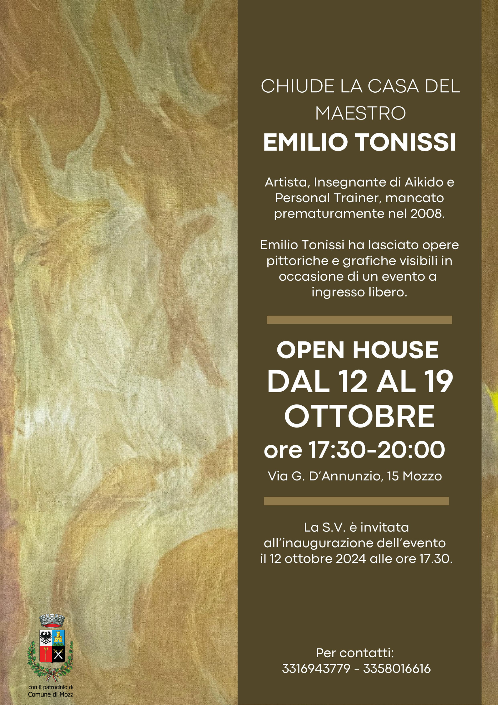 “Open House” è una mostra che si avvale del patrocinio del Comune di Mozzo. Per volontà della famiglia alcune opere di Emilio Tonissi verranno donate alla comunità di Mozzo.