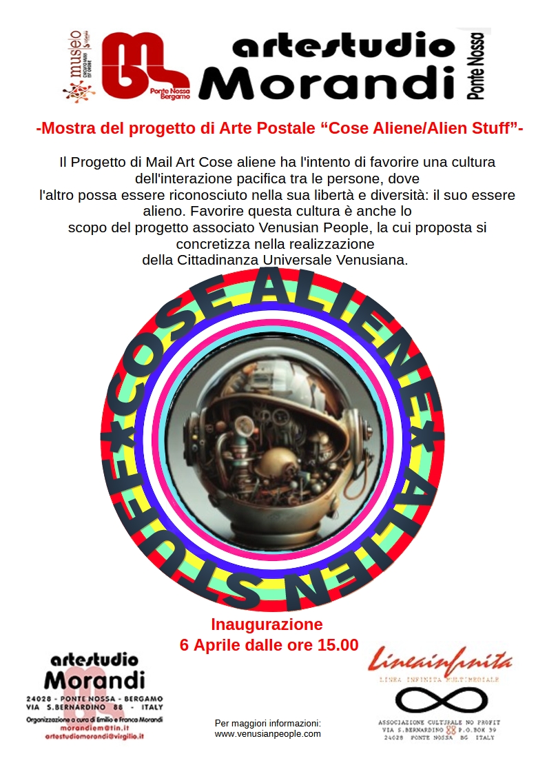 ArteStudio Morandi presenta la mostra del progetto Arte Postale "Cose Aliene/Alien Stuff". Il Progetto di Mail Art Cose aliene ha l'intento di favorire una cultura dell'interazione pacifica tra le persone, dove l'altro possa essere riconosciuto nella sua libertà e diversità: il suo essere alieno. Favorire questa cultura è anche lo scopo del progetto associato Venusian People, la cui proposta si concretizza nella realizzazione della Cittadinanza Universale Venusiana. L'inaugurazione è in programma sabato 6 aprile alle ore 15:00 presso ArteStudio Morandi a Ponte Nossa. Ingresso libero.