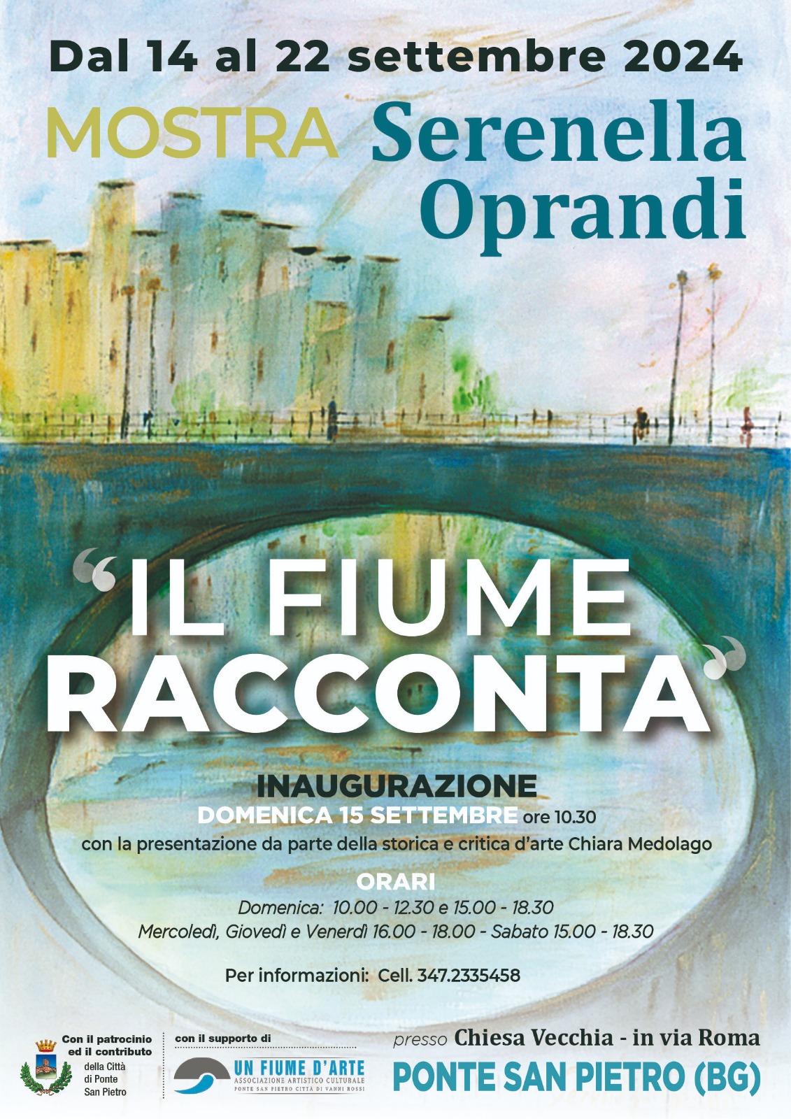 Serenella Oprandi espone a Ponte San Pietro la mostra dal titolo “Il fiume racconta...” le cui opere tracciano il percorso dell’acqua lungo il fiume, dall’origine nei ghiacciai alpini, sino al suo perdersi nei mari del Mediterraneo. Nel suo scorrere l’acqua attraversa luoghi e ambienti, spunto per la pittrice per ritrarre dettagli, sfumature ed emozioni messi su carta nei suoi acquerelli. L’esposizione si colloca nel contesto di “Un fiume d’arte”, manifestazione ormai tradizionale giunta alla sua nona edizione. L’iniziativa è patrocinata e col contributo della città di Ponte San Pietro e supportata dall’associazione artistico culturale “Un fiume d’arte”.