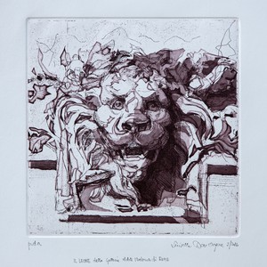 Luisella Dell'Acqua, Il leone di Roma, 2016, acquatinta, ceramolle, collage con carta washi e carte d'epoca 150x150 mm, Stampa su carta Hahnemuhle (560x390 mm)