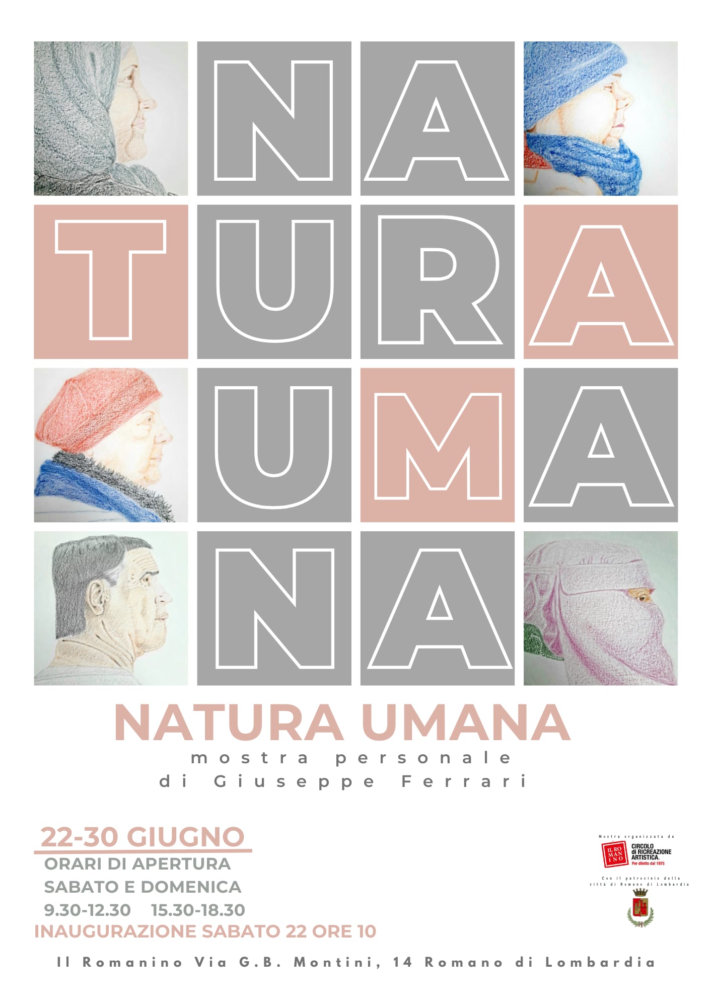 La Mostra "Natura Umana" è un progetto che ha preso vita diversi anni fa, quando Giuseppe Ferrari ha iniziato a creare una galleria di ritratti di persone comuni, incontrate per strada nella quotidianità. Ispirandosi alle effigi su monete, cammei e quadrerie antiche, Ferrari rappresenta i suoi soggetti di profilo, un modo di ritrarre che enfatizza l'unicità e la dignità di ogni volto. Utilizzando matite colorate e sanguigna, l'artista si concentra su pochi colori e linee essenziali, catturando l'essenza dei suoi soggetti con un tratto delicato e rispettoso. Ogni ritratto è un'opera unica che mette in risalto la bellezza e la storia personale di chi è ritratto, trasformando volti comuni in immagini di nobile eleganza.