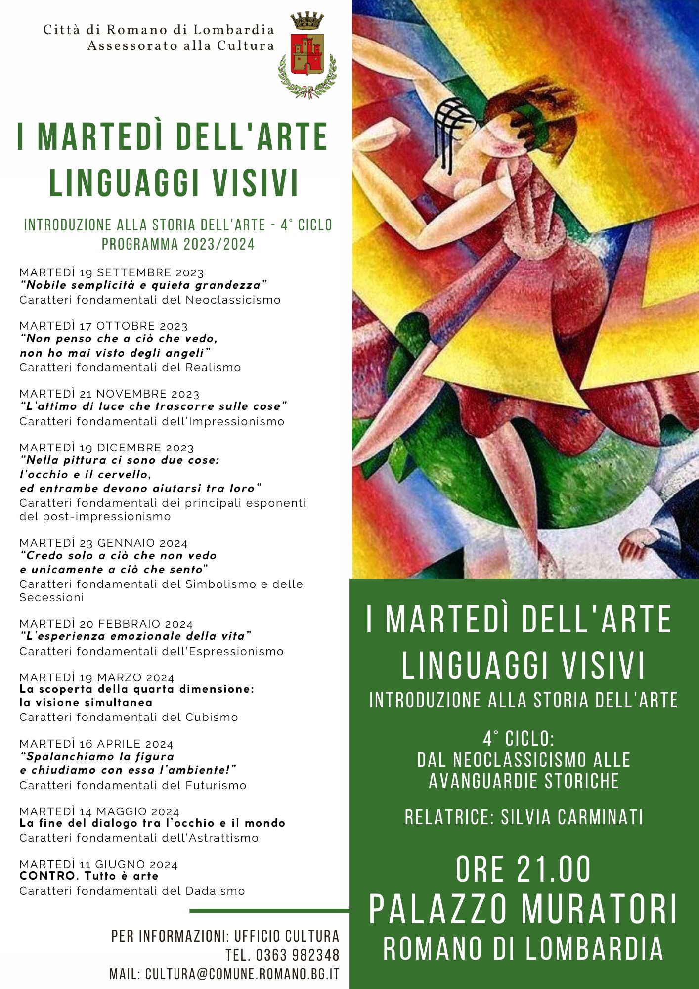 Nel mese di settembre prenderà avvio il 4° ciclo de "I martedì dell'arte – Linguaggi visivi" promosso dall'Assessorato alla Cultura del Comune di Romano di Lombardia. Un ciclo di dieci incontri d'introduzione alla Storia dell'Arte che per l'edizione 2023/2024 avrà come argomento "Dal Neoclassicismo alle Avanguardie storiche" e verrà condotto come per le precedenti edizioni dalla prof.ssa Silvia Carminati.