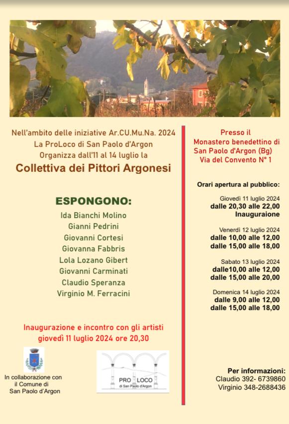 La ProLoco di San Paolo d'Argon organizza dall'11 al 14 luglio l'esposizione Collettiva dei Pittori Argonesi, presso il Monastero benedettino di San Paolo d'Argon.