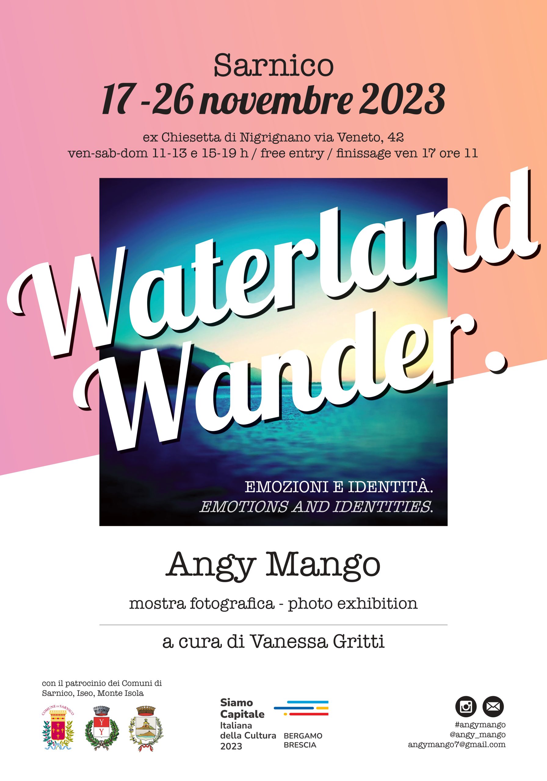 Da venerdì 17 a domenica 26 novembre, presso l'Ex-Chiesetta di Nigrignano di Sarnico, si terrà la mostra fotografica "Waterland Wander. Emozioni e identità" di Angy Mango, a cura di Vanessa Gritti.