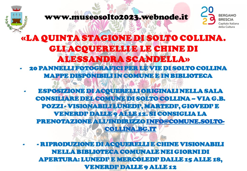 Fino a sabato 30 settembre 2023 il Comune di Solto Collina ospita la mostra denominata “La quinta stagione di Solto Collina – Gli acquerelli e le chine di Alessandra Scandella”.