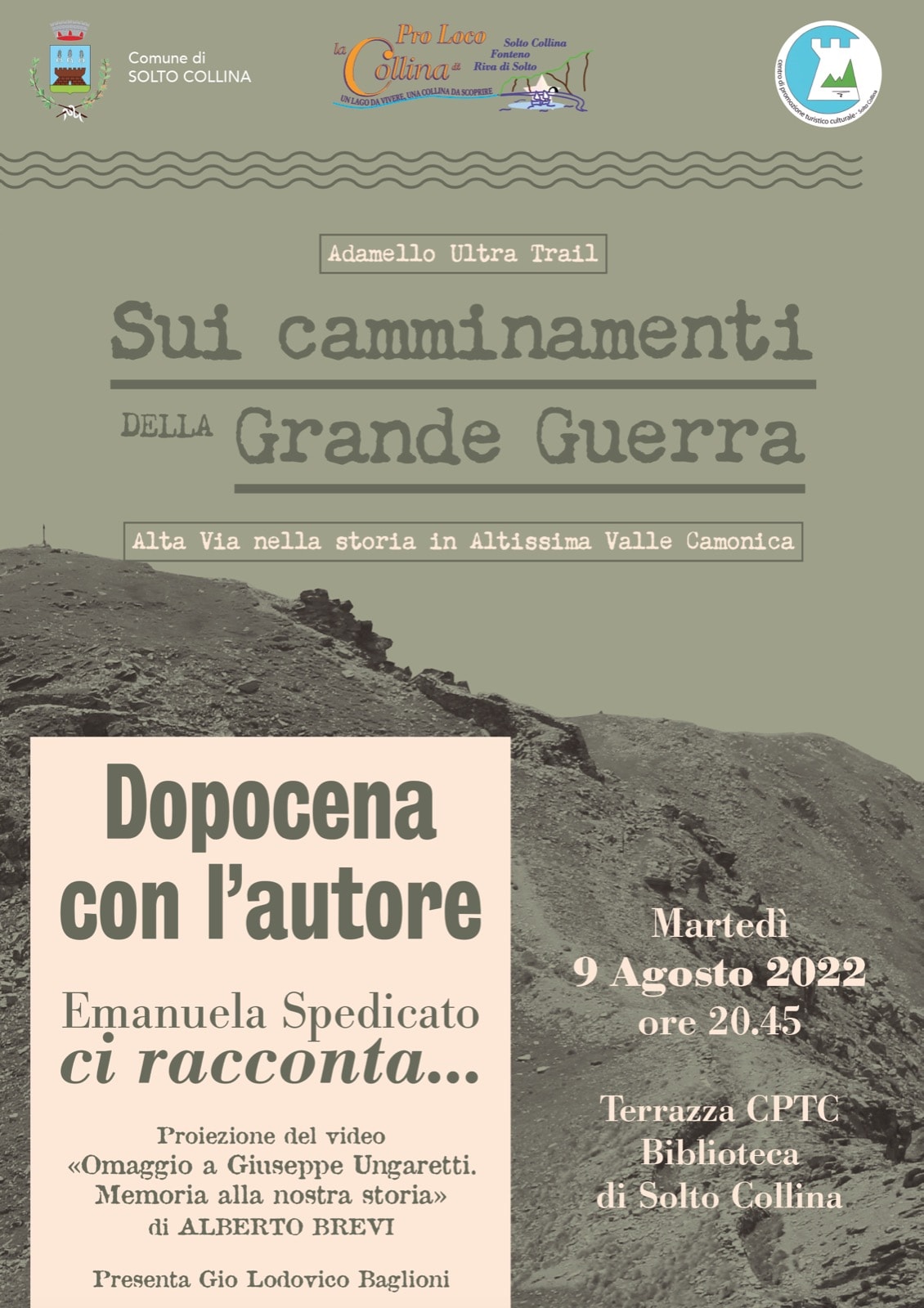 Martedì 9 agosto, secondo appuntamento con la rassegna “Dopocena con l’Autore”, Emanuela Spedicato presenterà il suo libro “Adamello Ultra Trail - Sui Camminamenti della Grande Guerra”