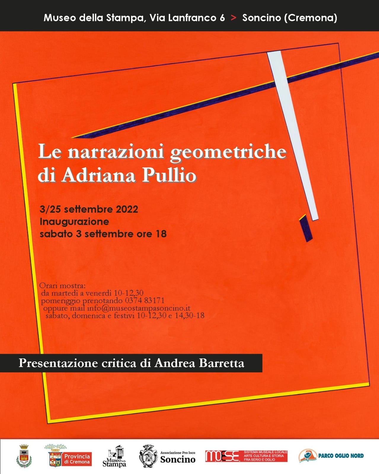 La mostra “Le narrazioni geometriche” Opere di Adriana Pullio è curata dal critico Andrea Barretta di Brescia.