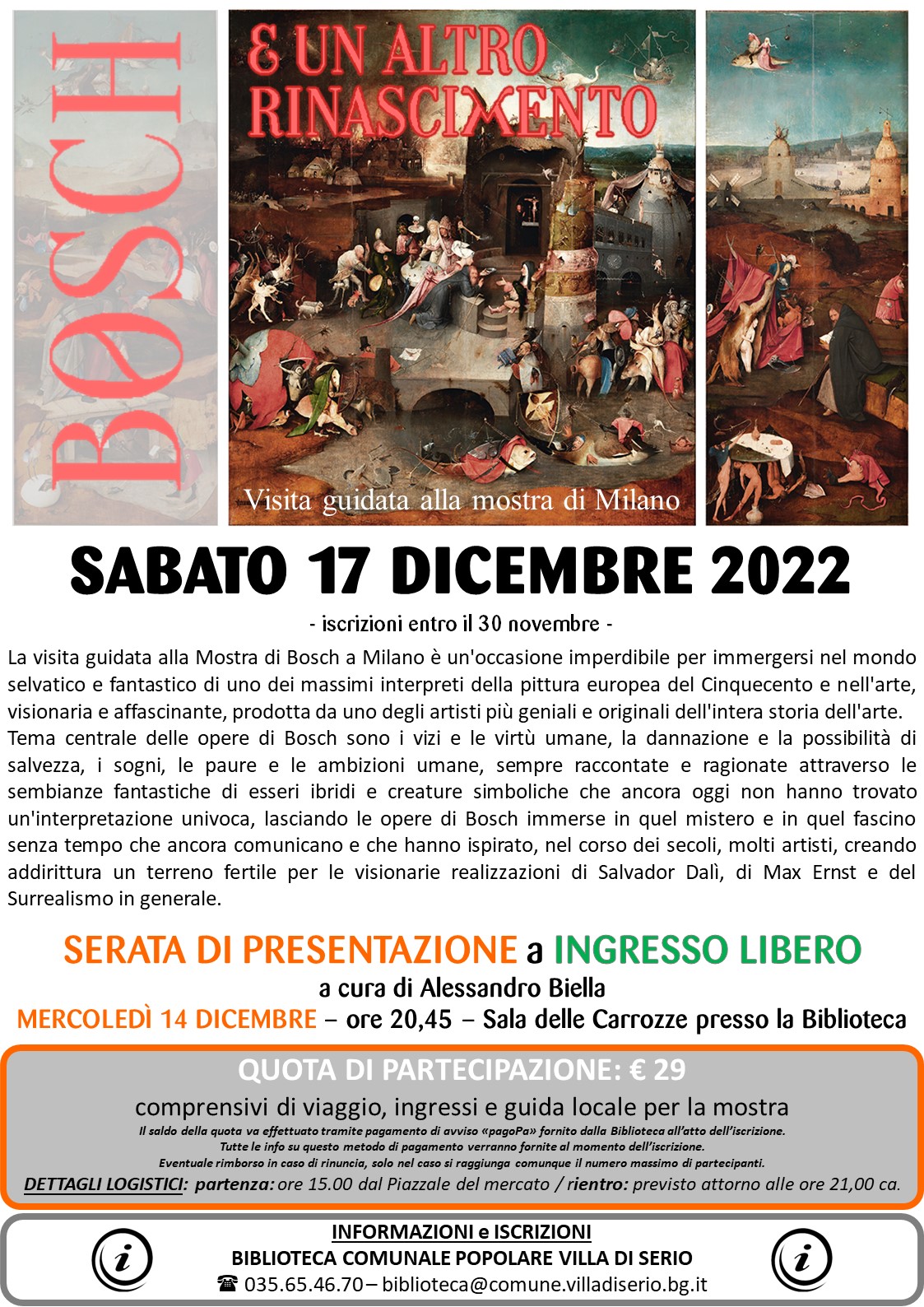 La Biblioteca di Villa di Serio organizza una serata di presentazione della mostra "Bosch e un altro Rinascimento" e della visita guidata alla mostra a Milano in programma per sabato 17 dicembre.