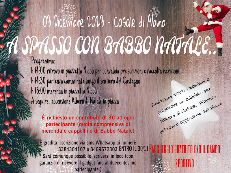 Per festeggiare insieme l'arrivo della figura più magica dell'anno, si organizza "A spasso con Babbo Natale", una camminata lungo il sentiero del Castagno per tutti i bambini.