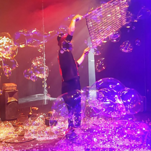 Nel suo spettacolo le vere protagoniste sono le bolle di sapone giganti che riempiono lo spazio, avvolgendo lo spettatore in una realtà onirica, evanescente e poetica. Amatissimo dai bambini, incanta anche gli adulti.