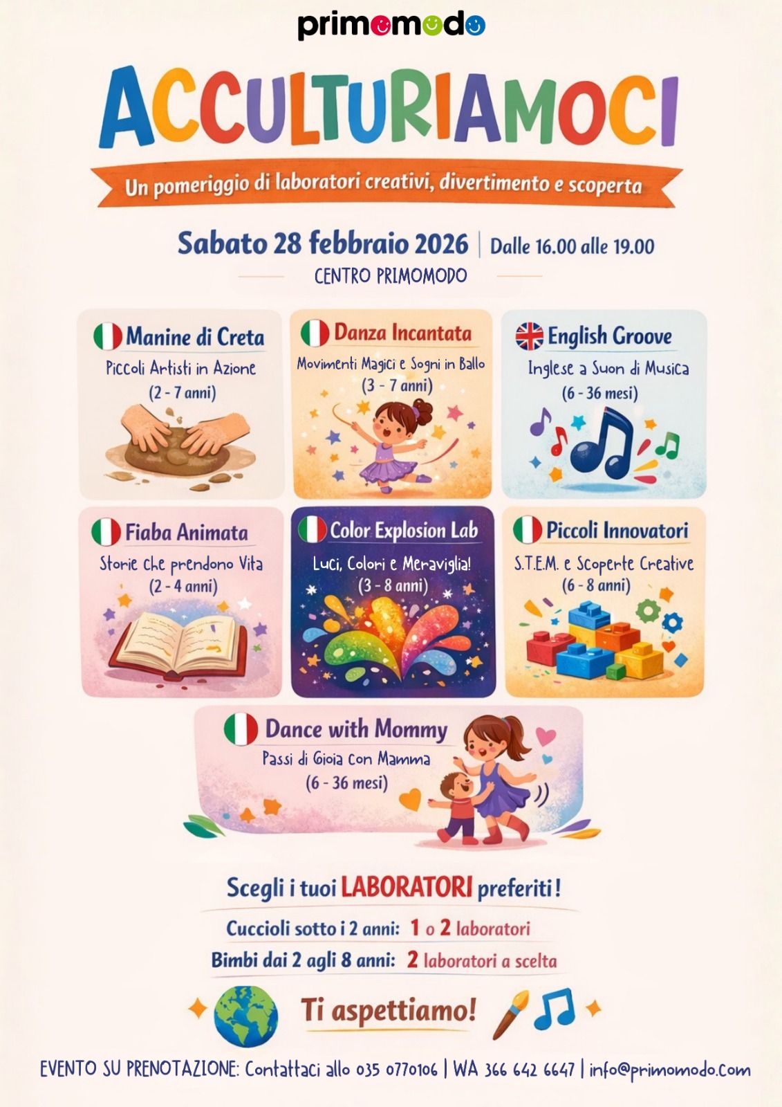 Bambini sopra i 2 anni, partecipazione obbligatoria a 2 laboratori € 35,00
