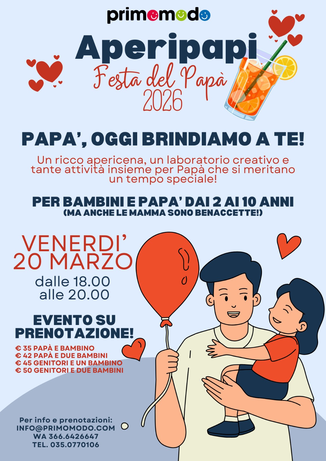 Al Centro Primomodo di Bergamo, un evento speciale per papà e bambini dai 2 ai 10 anni, con un ricco apericena e laboratori creativi per vivere insieme un tempo prezioso e divertente.
