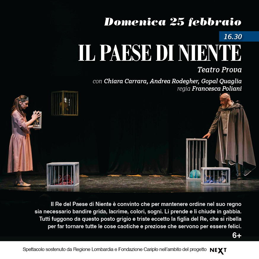 Il Teatro Prova di Bergamo continua con la rassegna "Giocarteatro" con lo spettacolo "Il paese di niente", una rappresentazione teatrale con Chiara Carrara, Andrea Rodegher e Gopal Quaglia.