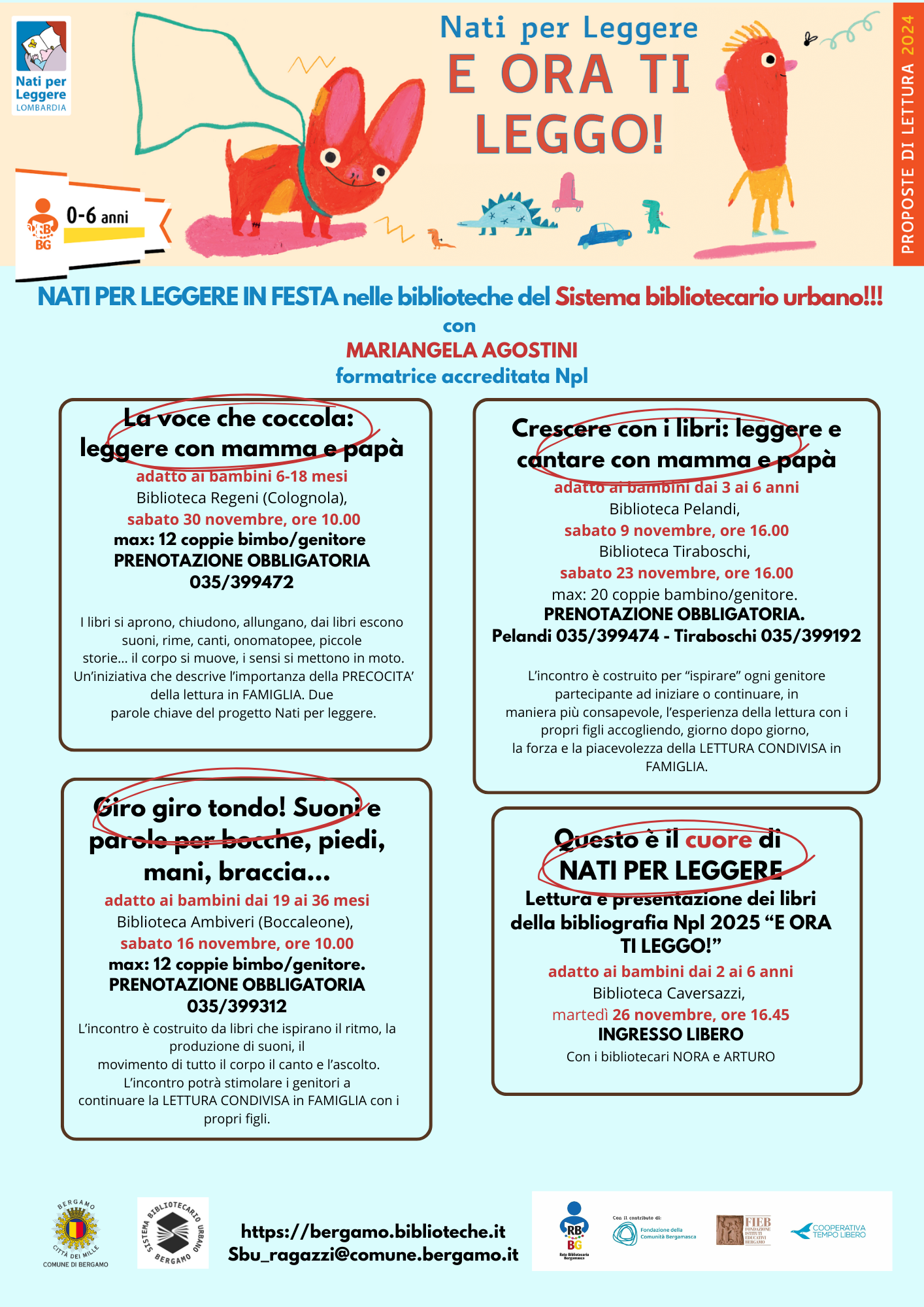 Continuano gli appuntamenti di "Nati per leggere in festa!": Leggere con mamma e papà. Un’iniziativa per famiglie con bambini 6-18 mesi che descrive l’importanza della precocità della lettura in famiglia.