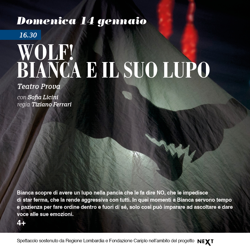 Il Teatro Prova continua con la rassegna "Giocarteatro" con lo spettacolo "Wolf! - Bianca e il suo lupo", un racconto per imparare ad ascoltare e dare voce alle emozioni. Con Sofia Licini; Regia di Tiziano Ferrari.