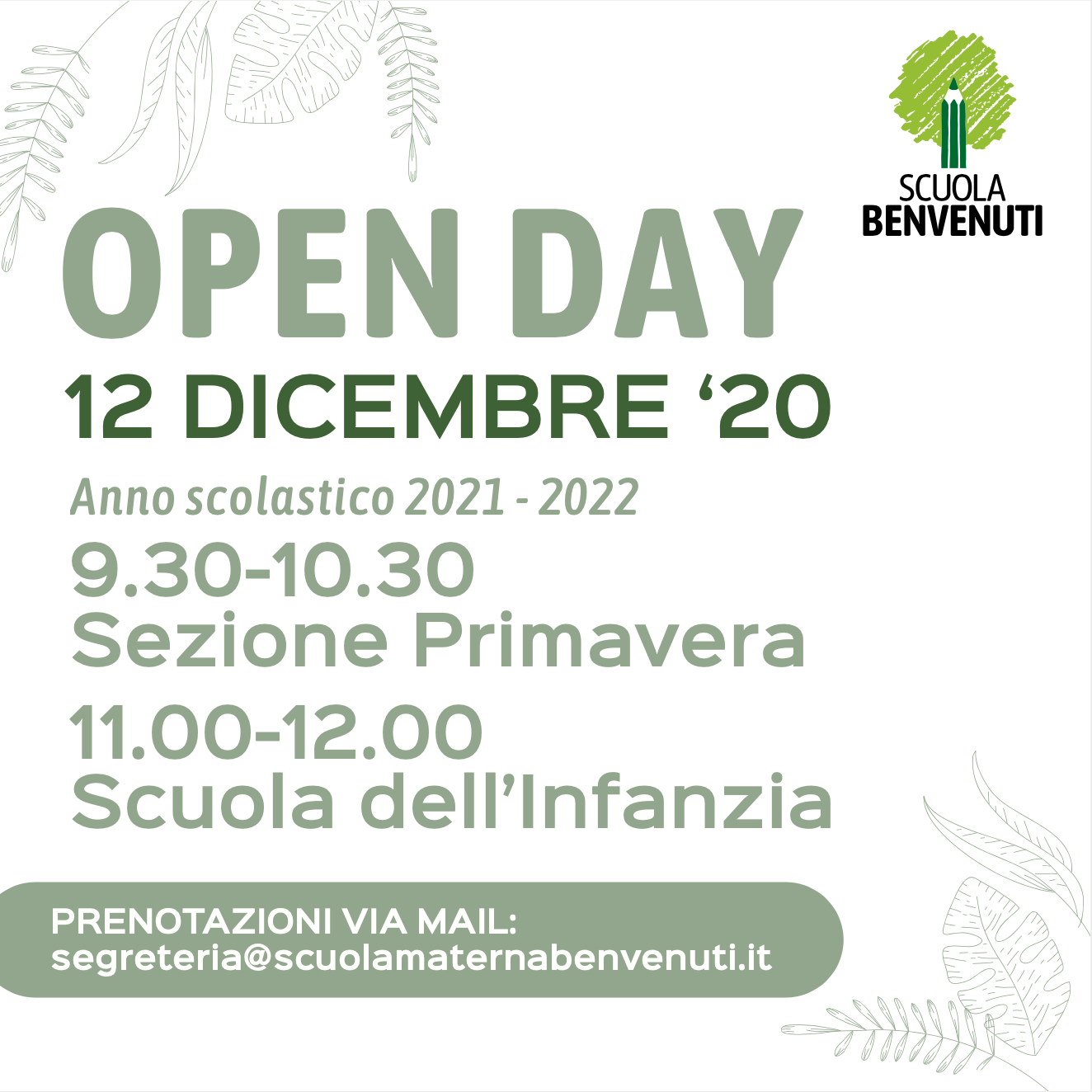 La scuola dell'infanzia Alessandra Benvenuti di Bergamo apre le sue aule e i suoi spazi virtualmente o in presenza, per un Open Day che si terrà – su prenotazione – sabato 12 dicembre. Dalle ore 9.30 alle ore 10.30 per la sezione primavera e dalle ore 11.00 alle ore 12.00 per la scuola dell’infanzia virtualmente. Oppure in presenza contingentata dalle 9.30 alle 12.00. L’open day permetterà alle famiglie di visitare la scuola, conoscere la didattica, il progetto educativo e incontrare il personale docente.