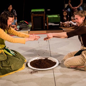 Al centro del palco, un cerchio, luogo del racconto e dell’ascolto, dove c’è un grande piatto colmo di terra (“il mondo della terra”) e due attrici. Attraverso il gioco delle attrici dell’esplorare, toccare, sentirne il profumo, reinventare creativamente lo spazio e la materia terra, il bambino riconosce e scopre i meccanismi, i gesti e le emozioni di un “suo” giocare.
