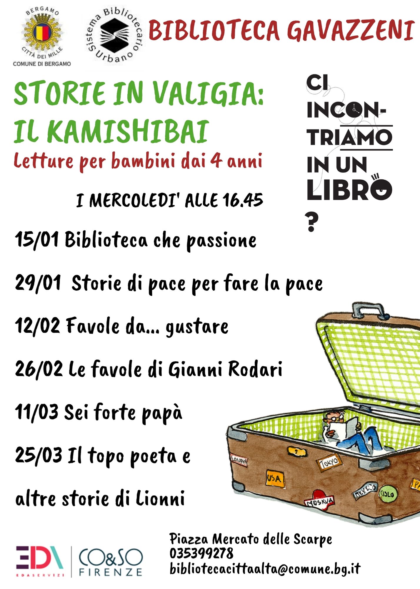 Mercoledì 26 Febbraio Bambini ANNULLATO / Le favole di Gianni Rodari Storie in valigia: il kamishibai. EVENTO CONCLUSO Letture per bambini dai 4 anni. Informazioni Prezzo: Ingresso gratuito Contatti Telefono: 035399278 Email: [email protected] VISITA IL SITO Organizzatore Sistema Bibliotecario Urbano di Bergamo Data e Ora Inizio: mercoledì 26 febbraio 2020 16:45 Giorni di apertura L M M G V S D Documenti Locandina Luogo Bergamo, Piazza Mercato delle Scarpe 3 Eventi Consigliati 5 Dom Ottobre h.16:30 / 18:00 Teatro di Loreto Bergamo Il Teatro delle Meraviglie al Teatro di Loreto La stagione teatrale «Il Teatro delle Meraviglie», dedicata ai piccoli e alle famiglie e prodotta da Pandemonium Teatro, torna dal 5 ottobre 2025 al 29 marzo 2026 con tanti spettacoli tutti da vivere. 15 Dom Marzo h.16:30 / 18:00 Teatro di Loreto Bergamo Le avventure di Signor Bastoncino Prosegue «Il Teatro delle Meraviglie» di Pandemonium Teatro, la stagione teatrale per i più piccoli e le famiglie al Teatro di Loreto. Sul palco Pandemonium Teatro con una storia poetica che parla di identità, coraggio e della gioia di ritrovarsi. 22 Dom Marzo h.16:30 / 18:00 Teatro di Loreto Bergamo Aahhmm... per mangiarti meglio Prosegue «Il Teatro delle Meraviglie» di Pandemonium Teatro, la stagione teatrale per i più piccoli e le famiglie al Teatro di Loreto. Sul palco Pandemonium Teatro con un viaggio teatrale tutto da vivere. 2 Dom Novembre h.10:45 / 18:00 Teatro San Giorgio Bergamo Duetto Per la rassegna «Giocarteatro», primo appuntamento di «Brutto anatroccolo days», il mese dedicato ai diritti dell'infanzia. Uno spettacolo che unisce voce, musica e danza. 16 Dom Novembre h.16:30 / 18:00 Teatro San Giorgio Bergamo Un condominio: vicini troppo lontani Prosegue la rassegna «Giocarteatro» con il debutto di «Un condominio: vicini troppo lontani», spettacolo che narra le vicende di un grande palazzo e del suo piccolo segreto. 23 Dom Novembre h.16:30 / 18:00 Teatro San Giorgio Bergamo PET Per la rassegna «Giocarteatro» di Teatro Prova, una messa in scena che racconta la storia di due bambini e del loro incontro con una piccola balena. Una storia appassionante, in grado di avvicinare anche i più piccoli al tema dell'inquinamento dei mari. 23 Dom Novembre h.16:30 / 18:00 Teatro San Giorgio Bergamo Il principe e il povero A chiusura dei «Brutto anatroccolo days», il mese dei diritti dell'infanzia, per la rassegna «Giocarteatro», il racconto di dure ragazzi, un principe e un povero, che decidono di scambiarsi i vestiti per vivere un giorno l'uno nei panni dell'altro. 16 Dom Novembre h.10:00 / 12:00 Casa Natale Donizetti Bergamo A colazione con Gaetano: musica, latte e fantasia! Per la serie di appuntamenti «Opera Family» del Teatro Donizetti, in programma un laboratorio di canto pensato per famiglie con bambini dai 6 anni, guidato da Mariagrazia Mercaldo: un’esperienza di scoperta condivisa attraverso la musica e la voce. ×