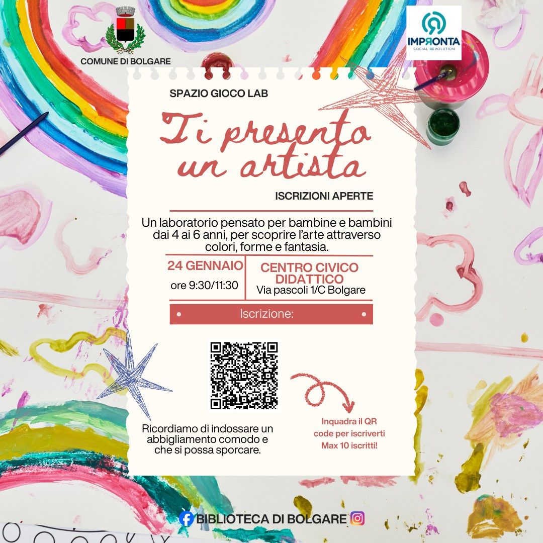 “Ti presento un artista” è un laboratorio creativo pensato per bambine e bambini dai 4 ai 6 anni, un’esperienza ludica ed educativa dedicata alla scoperta dell’arte attraverso il gioco. Durante l’attività i partecipanti saranno accompagnati in un percorso espressivo fatto di colori, forme e materiali, stimolando la fantasia, la curiosità e la libertà di sperimentare.