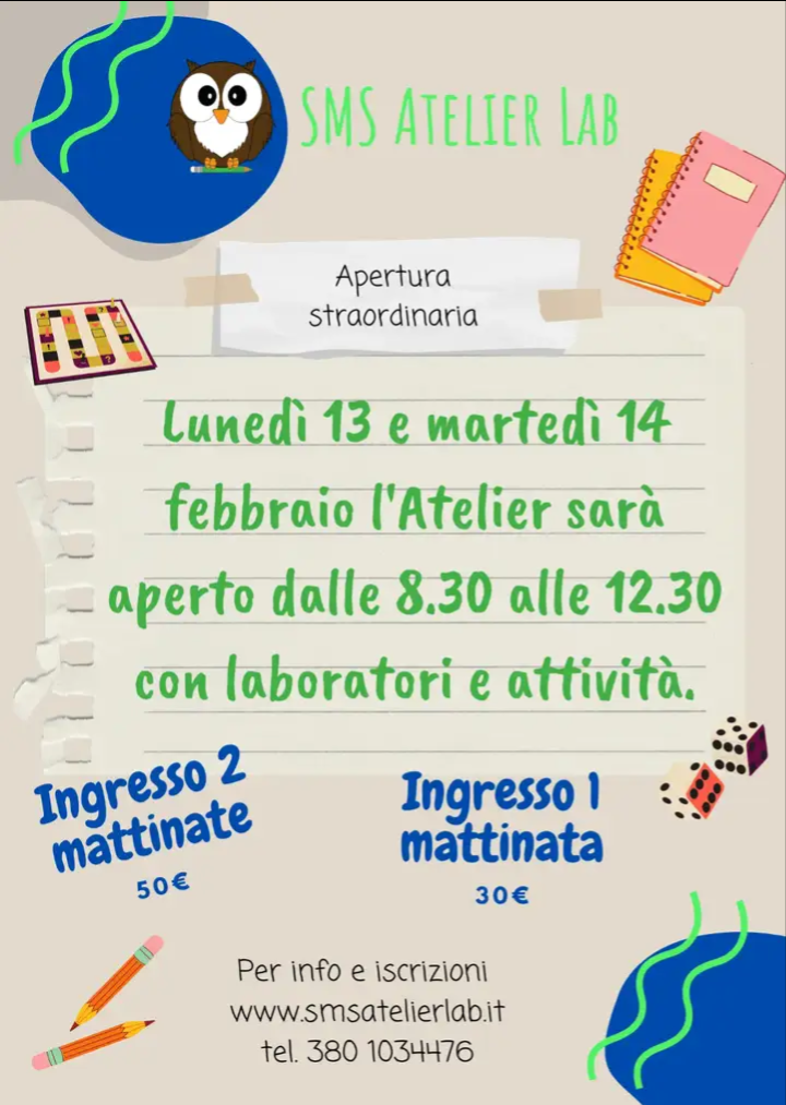 Lunedì 13 e martedì 14, in occasione della chiusura delle scuole per le elezioni regionali, l'Atelier offre il servizio di apertura mattutina. Si proporranno laboratori creativi, giochi, attività e momento compiti.