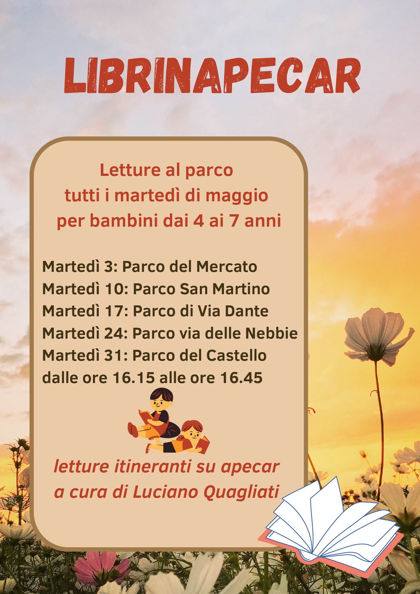 Letture itineranti su apecar a cura di Luciano Quagliati per tutti i bambini dai 4 ai 7 anni. Ultimo appuntamento.