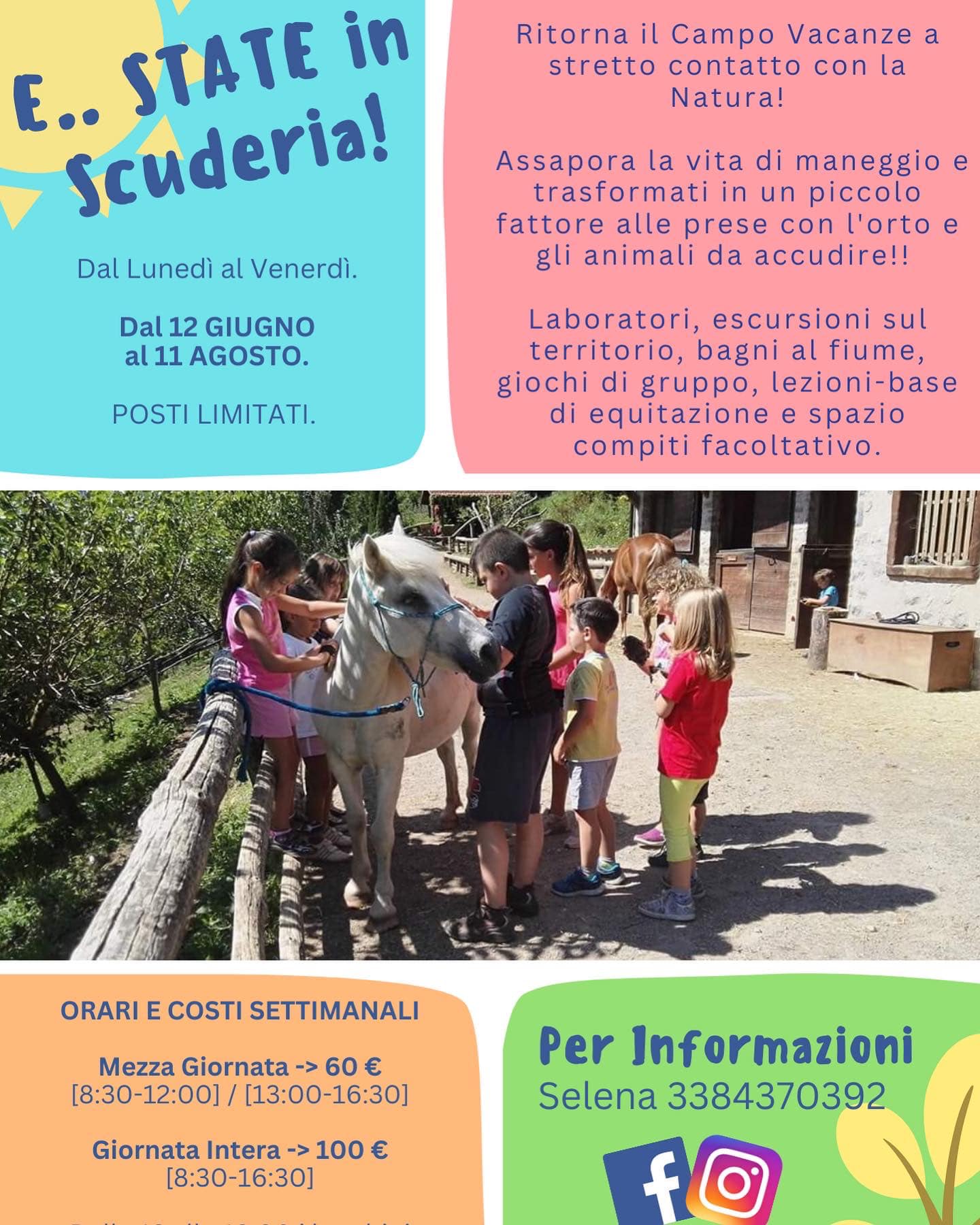 La giornata sarร arricchita con laboratori, escursioni sul territorio, bagni al fiume, giochi di gruppo, lezioni base di equitazione e, per non farsi mancare nulla, ci sarร anche lo spazio compiti facoltativo.