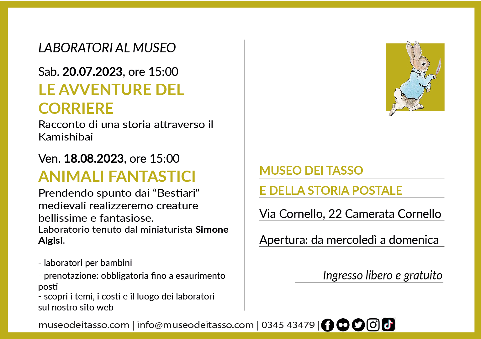 Ritrovo: ore 15 di fronte al Museo (via Cornello, 22 Camerata Cornello, BG). Per svolgere il laboratorio ci sposteremo negli spazi de "La Tana del Tasso - Rooms & Breakfast", a pochi passi dal museo