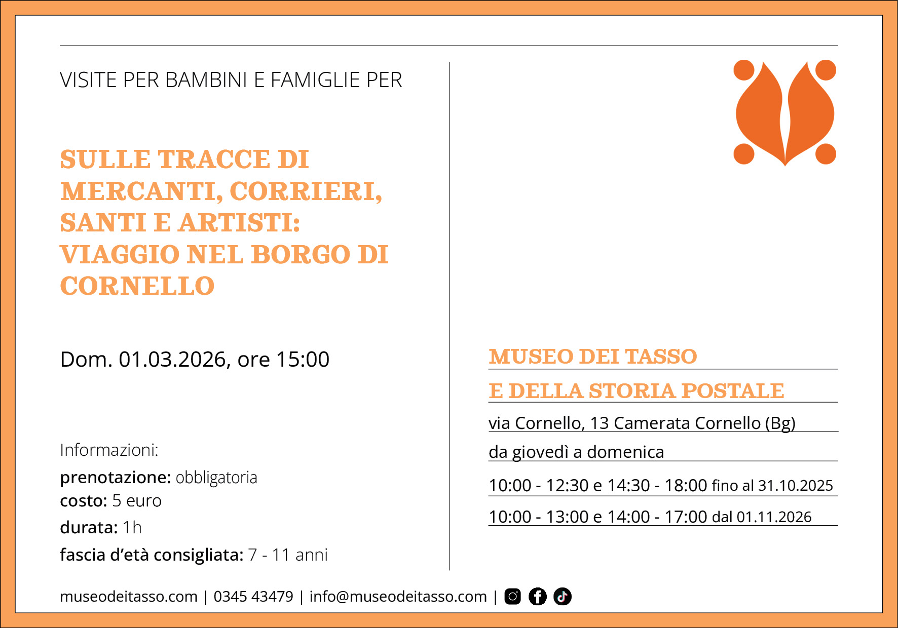 I bambini diventeranno degli esploratori che, attraverso alcuni elementi presenti nel borgo, ricostruiranno, con lโoperatrice museale, la storia del borgo medievale di Cornello e quella della famiglia Tasso.