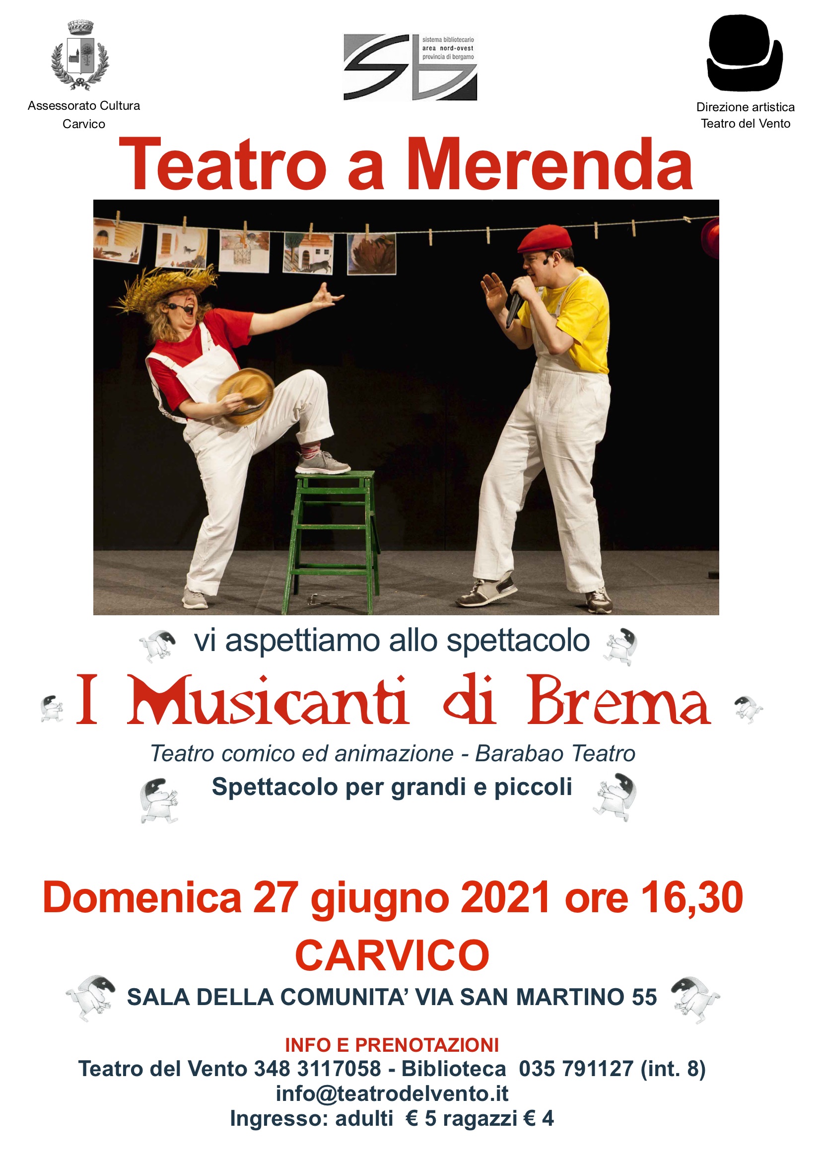 Domenica 27 giugno nella Sala della Comunità del Comune di Carvico Barabao teatro vi assicura un pomeriggio all’insegna del divertimento con “I Musicanti di Brema”.