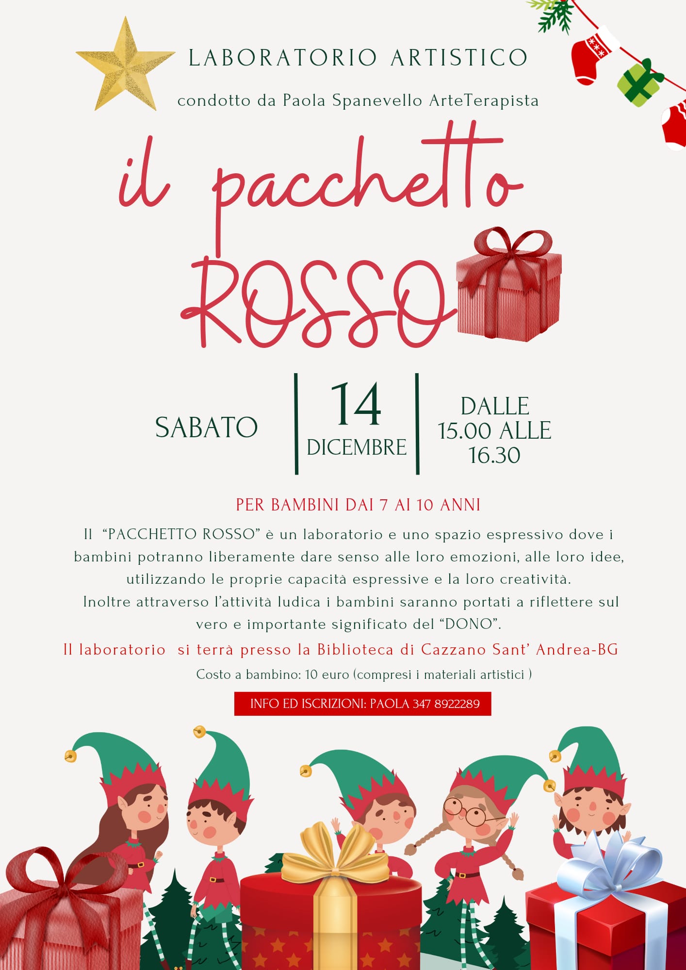 Sabato 14 dicembre dalle 15 alle 16,30, presso la Biblioteca di Cazzano Sant’Andrea, si terrà “Il Pacchetto Rosso”, un laboratorio unico pensato per bambini dai 7 ai 10 anni.