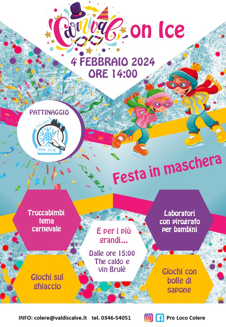 Al pattinaggio di Coloere, una festa in maschera in vista di carnevale per grandi e piccini, con tante attività in programma: truccabimbi a tema carnevale, giochi sul ghiaccio, laboratori con pirografo per bambini, giochi con bolle di sapone e per i più grandi merenda a base di Tè caldo e Vin Brulé.