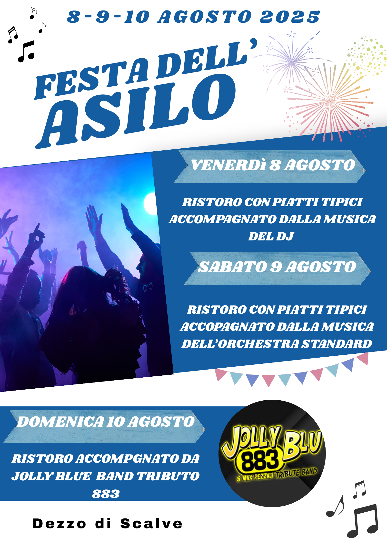 Anche quest'anno ritorna alla grande la Festa per l'Asilo del Dezzo, da venerdì 8 Agosto a Domenica 10 Agosto 2025! Tre giorno di piatti tipici, musica e buona compagnia!