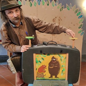 Da una valigia magica sbucano due storie. Le narra un curioso personaggio che accompagna le parole con delle immagini, dei suoni buffi e delle piccole sagome di cartone.