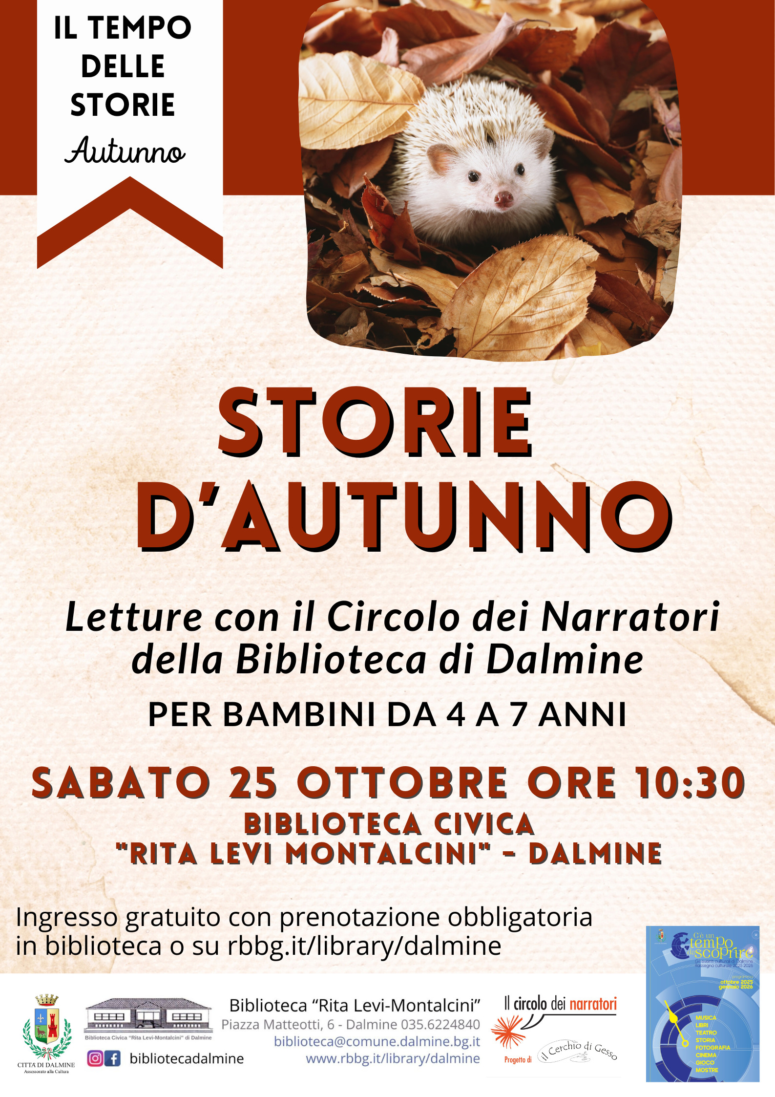 Per la rassegna culturale della città di Dalmine «C'è un tempo da scoprire» in programma delle letture per i più piccoli con il Circolo dei Narratori della Biblioteca di Dalmine.