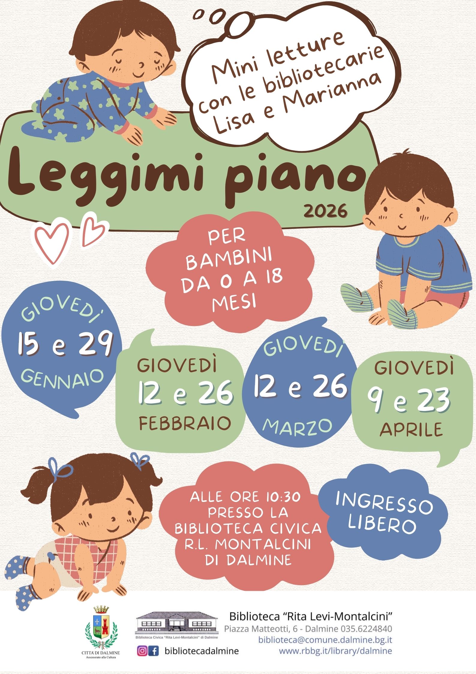 Per la rassegna culturale della città di Dalmine «C'è un tempo da scoprire» in programma mini letture con le bibliotecarie Lisa e Marianna, ideale per bambini dagli 0 ai 18 mesi.