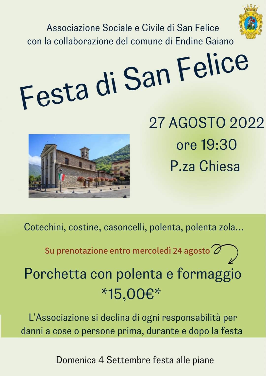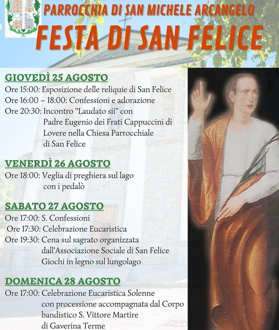La frazione di San Felice in festa con il tradizionale appuntamento di fine agosto con la festa patronale della pittoresca frazione. Cucina e piatti tipici.