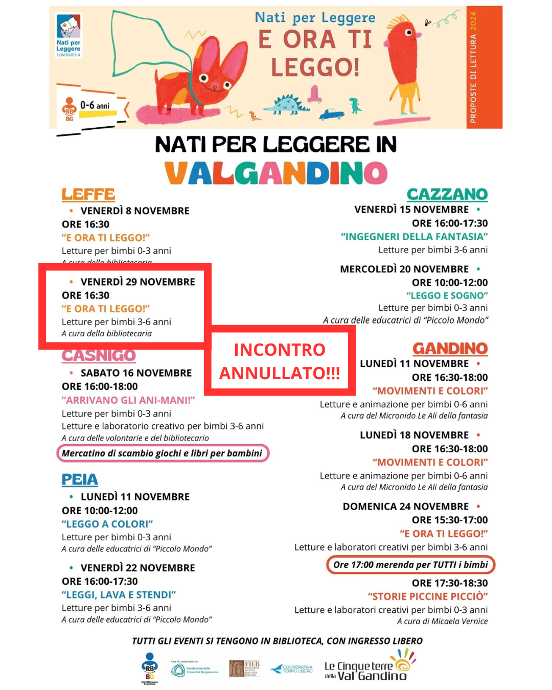 - 24 novembre: "È Ora Ti Leggo!" e "Storie Piccine Picciò", letture e laboratori creativi per bimbi 0-6 anni, a cura di Micaela Vernice. Merenda per tutti i bimbi alle ore 17:00.