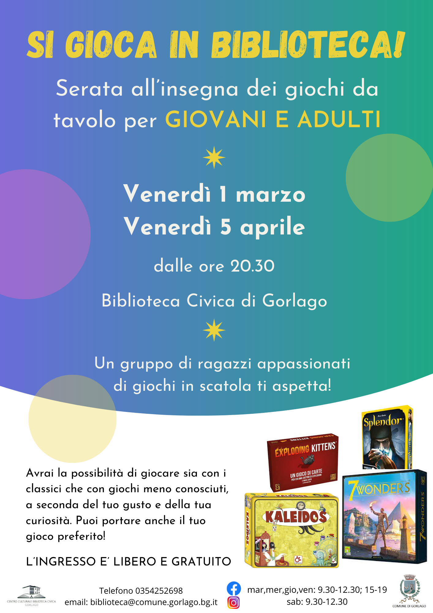Venerdì 5 aprile presso la Biblioteca Civica di Gorlago si avrà la possibilità di giocare, sia con i giochi in scatola classici che con quelli di più moderna produzione.