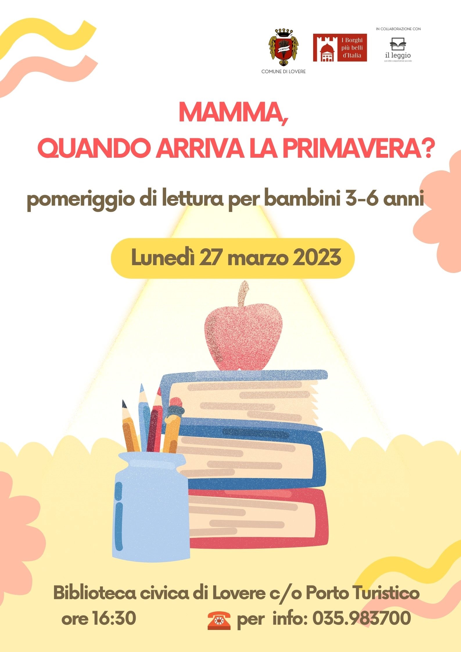 L'Amministrazione comunale, in collaborazione con la cooperativa “Il Leggio”, organizza un pomeriggio di lettura per bambini 3-6 anni dal titolo “Mamma, quando arriva la primavera?
